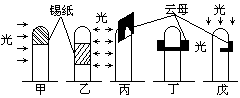 如右图所示,甲、乙分别用不透光的锡箔纸套在燕麦胚芽鞘的不同部位,丙、丁、戊、则分别用不透水的云母片插入燕麦胚芽鞘的不同部位,从不同方向照光,培养一段时间后,胚芽鞘的生长情况是