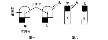 燕麦胚芽鞘经如下图一所示处理,一段时间后,取其甲、乙两块琼脂,置于已切去尖端的胚芽鞘A、B上,A以单侧光照处理如图二所示。则弯曲程度