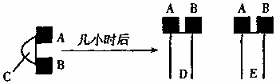 用燕麦幼苗作实验材料,在黑暗环境中进行实验,如右图所示,将被切下的胚芽顶端C紧贴在A、B两个琼脂块上。几小时后,将琼脂块取下,分别放在已切去顶端的胚芽鞘D及胚根E上。胚芽鞘D、胚根E的生长方向最有可能分别是