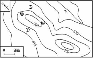 1.图中①、②、③、④四地,坡度最大的是( )