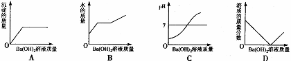 1.(10广安20).向盛有稀硫酸的小烧杯中慢慢滴加10%的Ba(OH)2溶液至过量,有关量的变化情况见下图(横坐标表示氢氧化钡溶液的质量,纵坐标表示小烧杯中量的变化)。其中错误的是 B