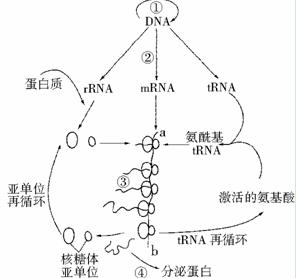 28.(10分)下图表示真核细胞内合成某种分泌蛋白过程中由DNA到蛋白质的信息流动过程,①②③④表示相关过程。请据图回答下列问题: