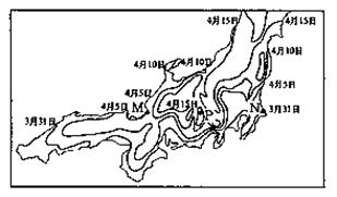 下图示意日本本州岛部分地区樱花初放日期。完成16~19题。