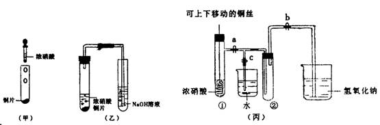 (Ⅱ)(11分)下图甲是旧教材中验证铜与浓硝酸反应的装置,乙是新教材对演示实验改进后的装置,丙是某校师生对乙作进一步改进并对所产生的气体的性质进行探究的装置。
