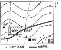 (2)图中A、B、C、D、E五处(不重复选择),适合建自来水厂的是 ,适合建钢铁厂的是 ,汽车贸易店和家具城放在靠近 处的地方较好。(填字母)