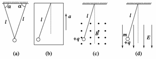 12.图25中各摆球可视为质点,各段绳长均为l,摆角均小于10°,(a)图在垂直纸面内摆动,(b)图中电梯匀加速上升,加速度为a,(c)图摆球带正电,磁场垂直纸面向外,(d)图摆球带正电,电场方向向下.求各摆的周期.