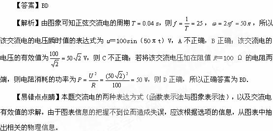 D.若将该交流电压加在阻值R=100 Ω的电阻两端,则电阻消耗的功率为50 W![]()