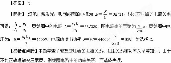 如图所示,理想变压器原、副线圈匝数之比为20∶1,原线圈接正弦交流电,副线圈接入“220V,60W”灯泡一只,且灯泡正常发光.则 ( )![]()