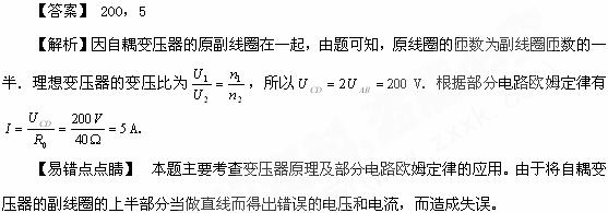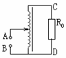 [6]如图所示,自耦变压器输入端A、B接交流稳压电源,其电压有效值UAB=100V,R0=40W,当滑动片处于线圈中点位置时,C、D两端电压的有效值UCD为___________V,通过电阻R0的电流有效值为_____________A.![]()
