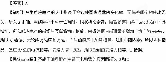 D 线圈绕P1转动时dc边受到的安培力大于绕P2转动时dc边受到的安培力![]()