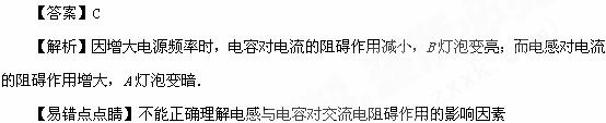 [14] 如图所示L为电感线圈,C为电容,A、B为两只相同的灯泡,将他们接在电压为U的交流电源上,两灯泡的亮度相同,若保持电源电压不变,而将电源频率增大,下列关于两灯泡发光情况说法正确的是