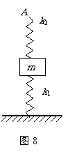 19(9分).如图8所示,一劲度系数为k1的弹簧,竖直地放在桌面上,上面压一质量为m的物体,另一劲度系数为k2的弹簧竖直放在物体上面,其下端与物体的上表面连接在一起,两个弹簧的质量都不计.要使下面弹簧的弹力减为原来的