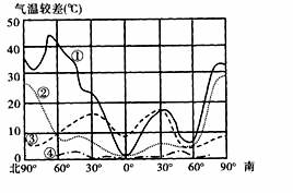 读气温较差、日较差随纬度变化曲线图,完成3-4题。