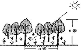 某地是我国重要的人工多层经济林区。下图为该地“某日太阳处在最高位置时的示意图”,此时北京时间为12 : 40,树影遮档地被植物的面积在一年中达到正午时的最大。读图回答8一9题。