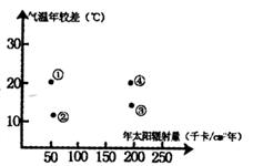 下图是成都、拉萨、伦敦、利雅得四城市气温年较差和年太阳辐射量图,回答7-8题。