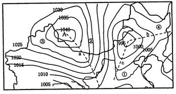 (2)图中虚线(a、b、c)附近易形成冷锋的是 ,图中①②③④地中,风速最大的是