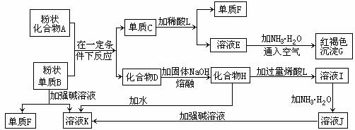 [点拨]本题看似复杂,但有一明显突破口,即溶液E中加氨水、通入空气得红褐色沉淀,此沉淀是Fe(OH)3,由此推断C为单质Fe,F为H2,E为亚铁盐;再往前推,粉状化合物和粉状单质发生置换反应,生成单质铁,应为铝热反应,故B为Al,D为Al2O3,H为NaAlO2,溶液I中含有Na+、Al3+。