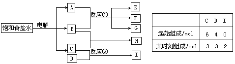 物质A跟B反应生成物质E、F和G;物质C跟D反应生成物质I,某温度下该反应起始和某时刻的反应混合物组成如右上表格所示。请填写下列空白: