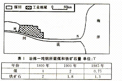 某钢铁厂于19世纪初建在M地,20世纪80年代将炼铁厂从M地迁至N地,炼钢厂仍留在M地,如下图所示。该钢铁厂所用的铁矿石一直依赖进口。图中河流可通航。结合表,回答24-25题。