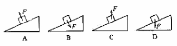 8. 物块静止在固定的斜面上,分别按图示的方向对物块施加大小相等的力F,A中F垂直于斜面向上。B中F垂直于斜面向下,C中F竖直向上,D中F竖直向下,施力后物块仍然静止,则物块所受的静摩擦力增大的是