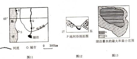 26.(11分)图11为某区域示意图,图12反映图11中的P地河谷剖面,P地河谷剖面的形成和地转偏向力的作用有关。图13反映图11对应的湖泊情况。读图回答问题