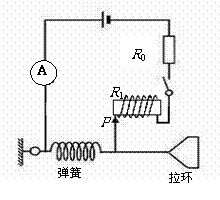 ,电源电动势E=3V,内阻不计。理想电流表的量程为0-100mA。当拉环不受拉力时,触头P刚好不与电阻