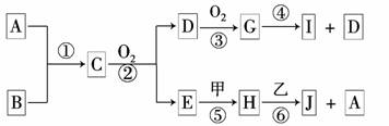 19.(8分)已知:A、B为常见的非金属单质且均为气体;甲、乙为金属单质,乙在I的浓溶液中发生钝化;C、H、J的溶液均呈碱性.各物质间的转化关系如下(部分生成物未给出,且未注明反应条件):