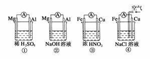 解析:Mg比Al活泼,在①中Mg做负极,但在NaOH溶液中,Mg不反应,而Al可以反应,故②中Al是负极。在浓HNO3中铁会钝化,故Cu为负极,Fe为正极。在④中由于不断向Cu极附近通入空气,而O2比溶液中的H+得e-能力强,故Fe失去的电子,在Cu极被O2得到。电极反应式为:O2+2H2O+4e-===4OH-。