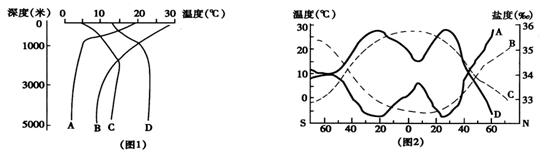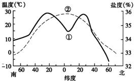 (2)60°S处海水温度约为 度,世界大洋平均盐度为 。