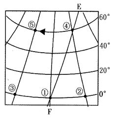 图中EF线是地球公转到近日点附近的晨昏线,箭头为地球自转方向,①点是东半球与西半球的分界线,②点位于西半球,①点与②、③两点的最短距离是3330km。据此回答4-6题: