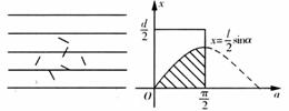 如左图,在平面内两两等距离的一簇平行直线,任意相邻两平行直线间的距离为d (d>0),向平面内任意抛掷一枚长为l (l<d)的小针,已知小针与平行线相交的概率P等于右图中阴影部分面积与矩形的面积之比,则P的值为( )