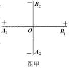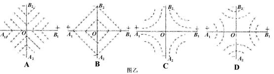 理论研究表明,无限大的均匀带电平面在周围空间会形成与平面垂直的匀强电场。现有两块无限大的均匀绝缘带电平面,一块两面正电,一块两面负电。把它们正交放置如甲图所示,单位面积所带电荷量相等(设电荷在相互作用时不移动),图甲中直线A1B1和A2B2分别为带正电平面和带负电平面与纸面正交的交线,O为两交线的交点,则图乙中能正确反映等势面分布情况的是 ( A )