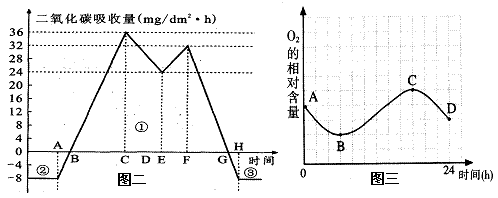 (5)下图二表示棉田内,棉叶在一天内吸收二氧化碳变化情况,如果C、F时间所合成的葡萄糖速率相等,均为36mg/dm2·h,则A、C、F三点的呼吸强度的比较结果是__________。试分析产生这一结果的原因:_____________________________,其中C点时的呼吸强度为_____________mgCO2/dm2·h。