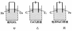 5.(2009·上海十四校联考)甲、乙、丙三个烧杯中分别装有稀硫酸、氯化铜溶液、饱和食盐水,把用导线连接的锌片和铜片插入甲,把分别与直流电流正、负极相连的C1、C2插入乙,把分别与直流电源正、负极相连的C3、铁片插入丙。则下列叙述正确的是 ( )