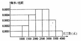 在全球金融风暴的背景下,某政府机构调查了某地工薪阶层10000人的月工资收入,并把调查结果画成如图所示的频率分布直方图,请将频率当作概率解答以下问题。