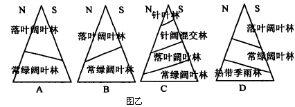 (3)下列四幅图中,最可能符合甲山地植被垂直差异的是: