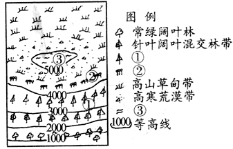 (2)造成①②两地针叶林分布高度差异的主要因素是: A.热量 B.光照 C.坡向 D.水分