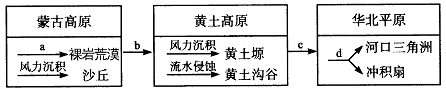 31、蒙古高原、黄土高原和华北平原因外力作用在成因上具有一定的联系。图8中各字母表示不同的主导外力作用类型,读图回答(1)-(2)题。
