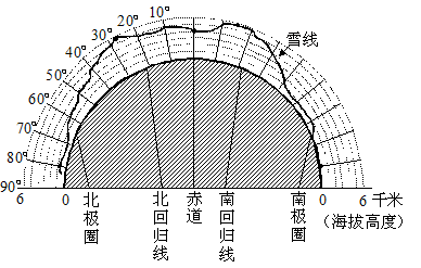 (1) 比较南北半球纬度45o两处,雪线较高的是_________,相差约__________千米。影响雪线高度的主要因素__________,造成南北纬45度雪线差异的原因是_____ _____。