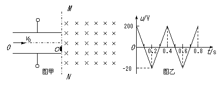 25.(20分)如图甲所示,两平行金属板间接有如图乙所示的随时间t变化的电压u,两板间电场可看作是均匀的,且两板外无电场,极板长L=0.2m,板间距离d=0.2m,在金属板右侧有一边界为MN的区域足够大的匀强磁场,MN与两板中线OO′垂直,磁感应强度B=5×10-3T,方向垂直纸面向里。现有带正电的粒子流沿两板中线OO′连续射入电场中,已知每个粒子的速度v0=105m/s,比荷q/m=108C/kg,重力忽略不计,在每个粒子通过电场区域的极短时间内,电场可视作是恒定不变的。