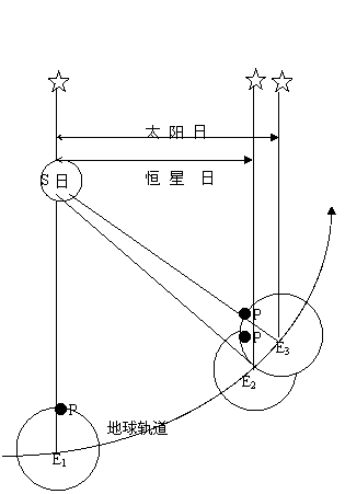 如右图是恒星日和太阳日比较。地球在轨道上有三个不同位置:第一个位置上E1,太阳和某恒在P地同时中天,这是一个恒星日和一个太阳日的共同起点。在第二个位置上E2,地球完成自转一周,恒星再度在P地中天,一个恒星日终了,但正午尚未到来。到第三个位置上E3时,太阳第二次在P地中天(SPE3在同一直线上),从而完成一个太阳日;那时恒星早已越过中天。读这个图必须注意,在太阳系范围内,太阳是中心天体,它的光线是辐散的;恒星无比遥远,它的光线可看作平行的,图中所示三颗星,指的是同一颗恒星。太阳日是日常生活的周期,古人云:日出而作日没而息。