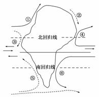 解析:依题意,中低纬度为以南北回归线为中心的洋流,其在北半球为顺时针,在南半球为逆时针。事实上此题可以直接根据图中洋流方向得出答案。