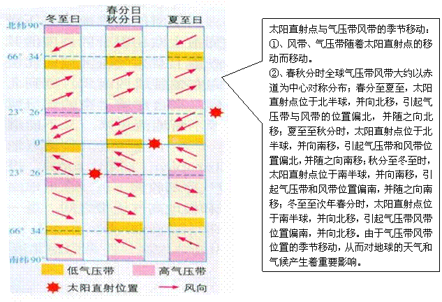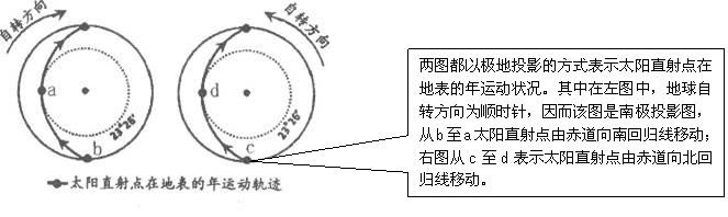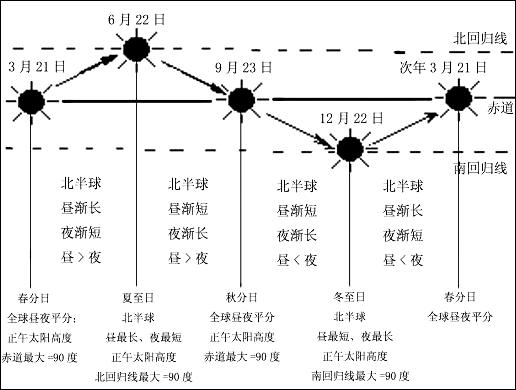 3、太阳直射点在地球南北纬23°26′之间往返移动的周年变化。如下图:
