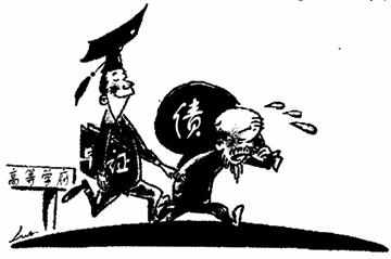 答案:(示例)儿子从高等学府毕业,收获的是一纸文凭;父亲头白背弯,收获的是沉重的债务。(关键词“文凭”“债务”)漫画揭示了普通家庭为子女教育不堪经济重负的社会现实和高等教育存在的制度缺陷。(关键词“普通家庭”“经济重负”“制度缺陷”,意思对即可)