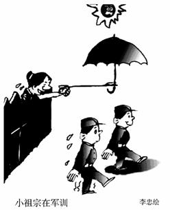 答案:(1)漫画的标题为《小祖宗在军训》。图中烈日下有两个孩子身穿军装正在齐步走(军训),一个孩子挥汗如雨;另一个孩子脚下却有阴凉,原来,他的母亲(奶奶)正隔着篱笆为他撑伞。 (2)讽刺了家长溺爱子女的现象。