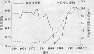图6为1969-2004年我国东部H省洪灾面积和洪涝灾害的复杂度指数变化图。读图并结合所学知识,回答53-54题。