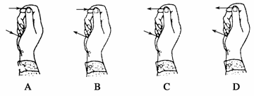 10、如图所示,用拇指、食指捏住圆规的一个针脚,另一个有铅笔芯的脚支撑在手掌心位置,使OA水平,然后在外端挂上一些不太重的物品,这时针脚A、B对手指和手掌均有作用力,对这两个作用力方向的判断,下列各图中大致正确的是 ( )