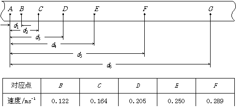 2、在“探究小车速度随时间变化规律”的实验时,某同学得到一条用打点计时器打下的纸带如图所示,并在其上取A、B、C、D、E、F、G等7个计数点,每相邻两个计数点间还有4个点,图中没有画出,打点计时器接周期为T=0.02s的低压交流电源。他经过测量和计算得到打点计时器打下B、C、D、E、F各点时小车的瞬时速度,记录在下面的表格中。