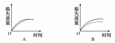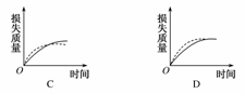 9.将a g块状碳酸钙与足量盐酸反应,反应物损失的质量随时间的变化曲线如下图的实线所示。在相同的条件下,将b g(a>b)粉末状碳酸钙与同浓度盐酸反应,则相应的曲线(图中虚线所示)正确的是 ( )