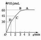 解析:根据V-t图像知,反应进行到1 min时,放出O2的体积为30 mL,反应进行至2 min时,放出O2 45 mL,反应进行至4 min时,放出O2的体积达最大值60 mL;由V-t曲线的斜率变化可知:D、C、B、A的反应速率逐渐减小,这是因为随着反应的进行,c(H2O2)逐渐减不,反应速率逐渐变慢;